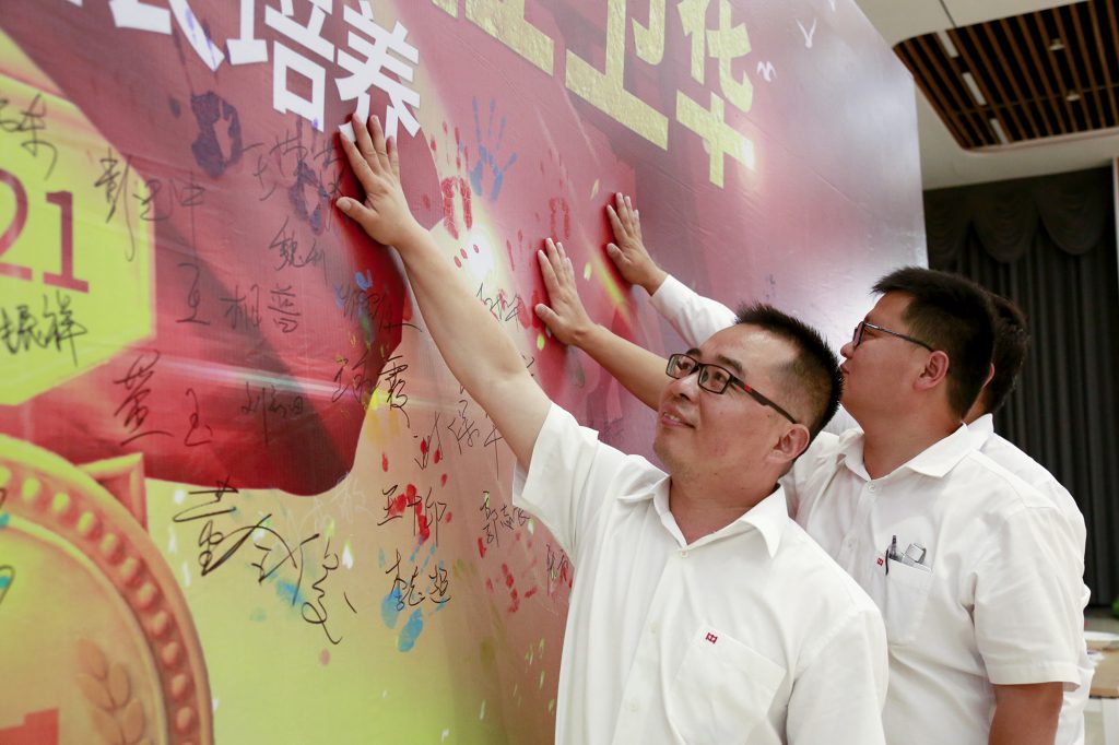 各位班组长学员在当初许下“学习先进管理知识,打造bwin·必赢金牌班组”铮铮誓言的签名墙上留下掌印,五彩斑斓的掌印天空,记录了他们一路成长的印记。